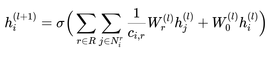 W_r^{(l)} and W_0^{(l)} are trainable weight matrices for relation r and the self-connection.