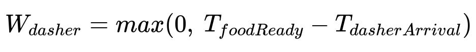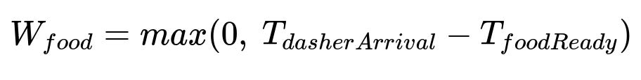 Dasher wait time (W_dasher) is the amount of time the Dasher waits at the restaurant if the food is not yet ready. T_foodReady is the restaurant’s actual completion time. T_dasherArrival is the Dasher’s arrival time at the restaurant.