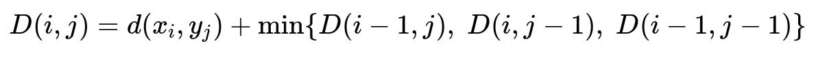 This recurrence relation calculates the cumulative cost matrix D, where d(x_i, y_j) is the Euclidean distance between data point x_i in one series and y_j in another. D(i,j) is the minimal cumulative alignment cost up to indices i in one series and j in the other. FastDTW constrains the search area for D(i,j), reducing computations.