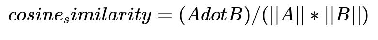 Here, A and B are embedding vectors for two images. A dot B represents the dot product of A and B. ||A|| is the magnitude (norm) of vector A, and ||B|| is the magnitude of vector B. The closer the ratio is to 1, the more similar the images.