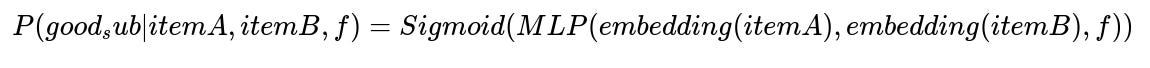 Where P(good_sub | itemA, itemB, f) is the probability that itemB is a suitable replacement for itemA given additional features f. embedding(itemA) and embedding(itemB) are vector representations of the items. MLP(...) is a multi-layer perceptron combining both item embeddings and other signals. Sigmoid(...) ensures the output is a probability between 0 and 1.