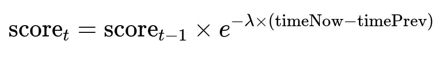 score_t is the updated score for a specific word at the current time. score_{t-1} is the wordâs previous score. lambda is a decay constant. timeNow - timePrev is the elapsed time between consecutive uses of that word, measured in any consistent unit (like seconds). Words with lower score are removed once storage is tight.