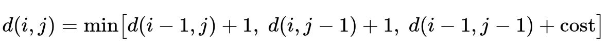 d(i, j) is the distance between the first i characters of one string and the first j characters of another. cost is 0 if characters match, or 1 otherwise. If the distance from a new term to a known standard word is small, it is likely a typo. The system waits for enough confirmed occurrences before suggesting the new term.