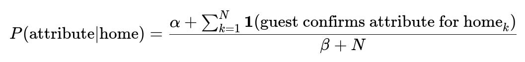 Below is an example of a Bayesian-style update formula to represent the probability that a home has a certain attribute, given guest confirmations: