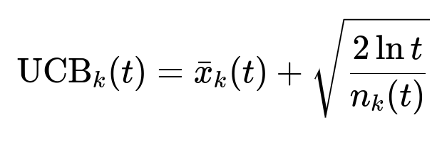 Some solutions use a multi-armed bandit approach to continuously adapt bidding strategies. A key formula for the upper confidence bound (UCB) method is: