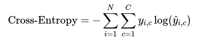 Here, y_{i,c} is 1 if the i-th exampleâs label is category c, else 0. The modelâs predicted probability for category c is denoted by hat{y}_{i,c}. N is the number of training examples, and C is the number of possible classes (4 in this case).