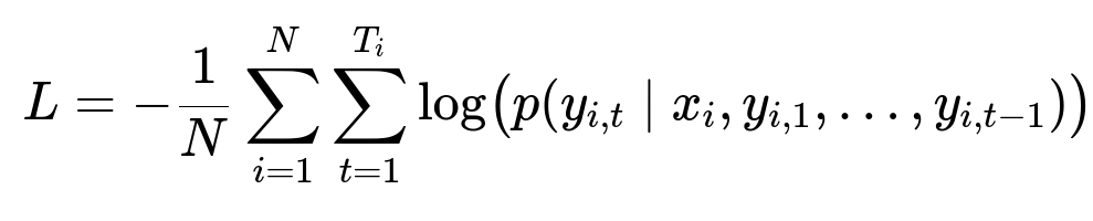 N is the number of training examples, T_i is the number of tokens in example i, p(...) is the probability of predicting the next token y_{i,t} given the source text x_i and previously generated tokens.