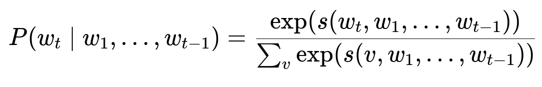 Here, w_{t} is the next token, w_{1} through w_{t-1} are previous tokens, and s(...) measures compatibility between tokens. The model computes exponential scores for each possible next token and normalizes them with a softmax.