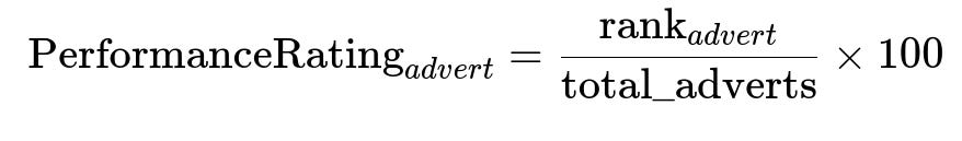 Here rank_{advert} is that advertâs position (with predicted performance) among similar adverts, and total_adverts is the total comparable group. This yields a 0â100 scale. Any jump when upgrading the package translates into a higher percentile score.