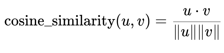 Above formula computes the dot product of two vectors u and v, then normalizes by their magnitudes. Higher values indicate greater similarity.