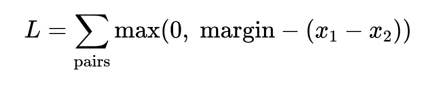 Here x1 and x2 are scores for two dishes. The margin enforces a required gap between relevant and irrelevant predictions. For three dish types (clicked, shown, random), the loss ensures: clicked_dish_score > shown_dish_score > random_dish_score by at least a chosen margin.