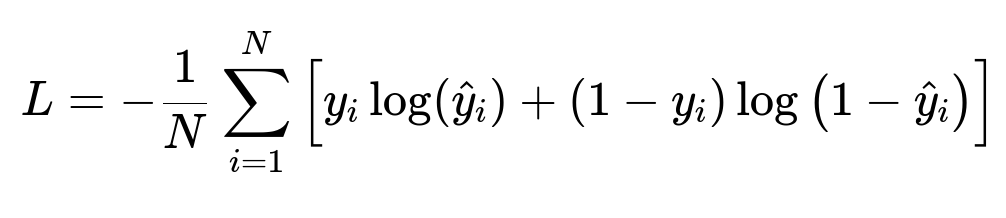 N is the number of examples. y_i is the true label (update accepted or not). hat{y}_i is the predicted probability of acceptance. This cost function is minimized during model training to optimize parameters.