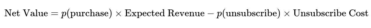 Where p(purchase) is the probability of a customer making a purchase after receiving a sales email, p(unsubscribe) is the probability of unsubscribing, and p(no action) = 1 - p(purchase) - p(unsubscribe).
