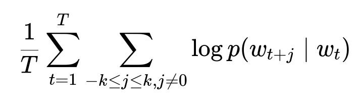 T is the total number of words. w_t is the target word at position t. k is the window size. p(w_{t+j} | w_t) is the probability of seeing context word w_{t+j} given w_t. Each embedding vector is learned by maximizing the likelihood of seeing actual context words around the target words.
