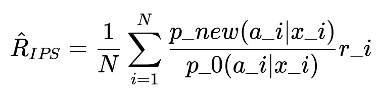 N is the total number of logged events. x_i is the context, a_i is the action taken, r_i is the observed reward. p_new(a_i|x_i) is the new policyâs probability of that action for context x_i, and p_0(a_i|x_i) is the old policyâs probability. This ratio weighs each observed reward by how often the new policy would select that same action compared to the old policy.