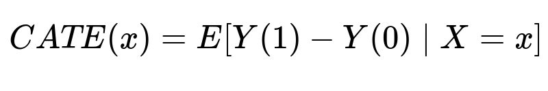 CATE(x) indicates the difference in expected outcome if a user with features x receives a message (treatment = 1) versus not receiving it (treatment = 0). Y(t) is the outcome for a user if assigned treatment t, and X is the feature vector describing that user. The model predicts this difference to identify users who will benefit from messages.