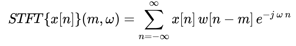 x[n] is the discrete-time audio signal. w[n] is a window function applied around index m. ω is the frequency index in radians. The summation slides across the signal, producing frequency content at each time-window. The dominant frequencies reveal engine rotational tones and potential anomalies.