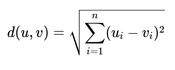 Where u and v are embedding vectors. The index i runs over vector dimensions. Larger distance means weaker similarity. Smaller distance means stronger similarity.