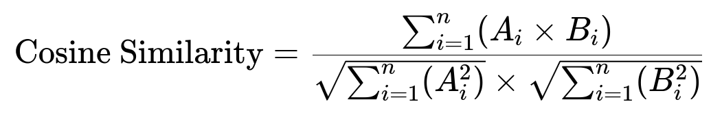 A is the embedding vector for the model-generated response. B is the embedding vector for the reference answer. A subscript i denotes the i-th component of the respective vector. Summations are taken over n components in the vectors.