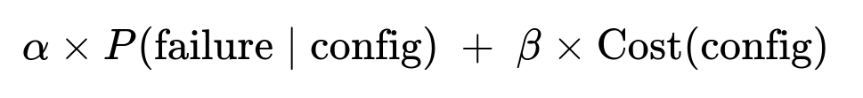 P(failure | config)is the predicted chance of failure with the candidate configuration.Cost(config)is the predicted compute expense in dollars.alphaandbetaare coefficients reflecting trade-offs (e.g., a higher alpha places more emphasis on minimizing failures over saving cost).