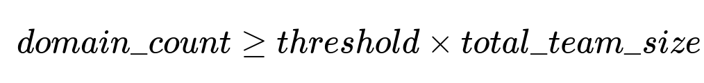The primary decision rule states that a domain is considered internal if its total user count on the team is above a configurable threshold multiplied by the total team size.