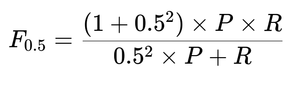 Here, P is precision and R is recall. F0.5 heavily weights precision. High precision is crucial because users dislike unnecessary or incorrect edits.