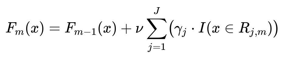 F_m(x) is the boosted model at iteration m. F_{m-1}(x) is the model from the previous iteration, and x is the feature vector. nu is the learning rate. R_{j,m} are the leaf regions for tree m, and gamma_j is the region-specific weight. I(...) is an indicator function. This additive approach creates more expressive boundaries over the feature space.