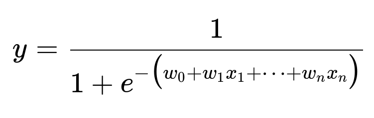 y is the predicted probability of fraud. w_0 ... w_n are learned weights. x_1 ... x_n are feature values. This model linearly combines features, then applies a logistic transform. Nonlinear patterns require additional handcrafted features.