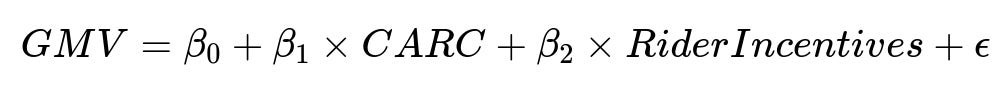 GMV represents predicted gross merchandise value. CARC is the customer acquisition and retention cost spend. RiderIncentives is the total rider incentive spend. beta_{0}, beta_{1}, and beta_{2} are learned parameters. epsilon is the error term.