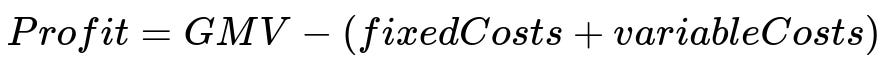 Profit is computed from predicted GMV minus total costs. fixedCosts may include overhead. variableCosts may include supply chain expenses and incentive spends. Calibrate these components to reflect real budget constraints.