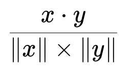 Here, x and y are vector embeddings. The dot product measures component-wise alignment, and the norms measure magnitude.