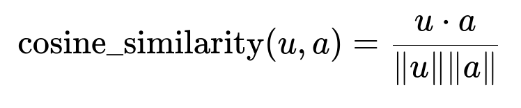 where u is the user embedding, a is the audience embedding, u dot a is the dot product, and |u|, |a| are the Euclidean magnitudes of the vectors.