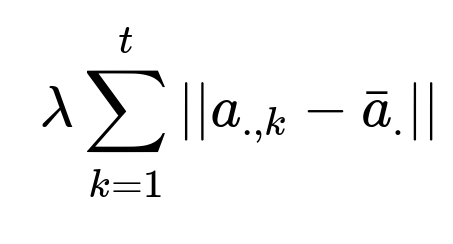 Here, a_{.,k} represents the parameter vector for the k-th task, and bar{a}_{.} represents the mean parameter vector across tasks. lambda controls how strongly we push tasks to stay close to the mean. This helps handle tasks with smaller sample sizes or higher imbalance.