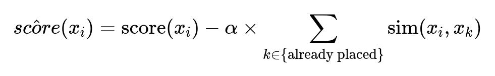 For the next position, re-score each remaining listing with the similarity penalty included in hat{score}.