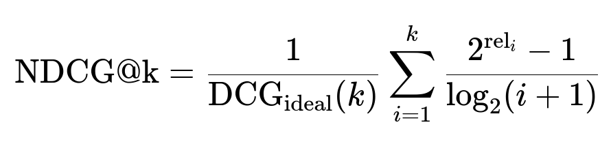 Above, rel_i is the relevance of the item at position i, DCG_ideal(k) is the best possible DCG for the top k positions, and log_2(i+1) discounts lower-ranked positions. NDCG captures both relevance and position of relevant items.