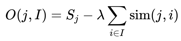 Pure ranking by predicted score often clumps similar items together. The system injects diversity with a post-ranking step using a maximal marginal relevance approach. The objective function for selecting the next item j, given a set I of already-chosen items, is: