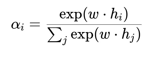 Here, alpha_i is the attention weight for the i-th token, exp is the exponential function, w is a learnable vector, and h_i is the hidden state of the i-th token. The weighted sum of all hidden states becomes the final representation for classification. Words with higher alpha_i contribute more to the predicted label.