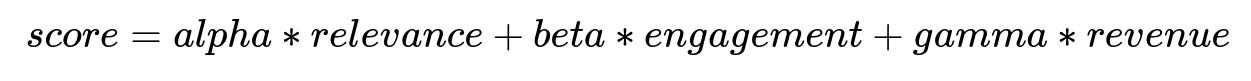 When new items and carousels are shown, the platform must decide how to rank them relative to core search results. A common approach is to compute a combined score that balances relevance, user engagement, and business objectives.