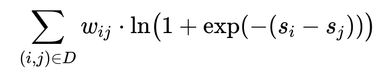 (s_i - s_j) determines the pairwise comparison. Minimizing this term encourages ranking relevant items (with higher user action signals) above less relevant items.