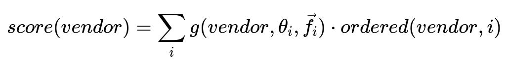The summation is over comparable customers i. The function g maps the vendor, the angle theta_i between the target customer’s feature vector and customer i’s feature vector, plus any extra features f_i, to a similarity-based weight. The term ordered(vendor,i) indicates whether customer i actually ordered from that vendor. This yields a score for every vendor in the catalog, then ranks vendors in descending order of that score.