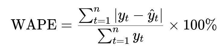 WAPE is Weighted Absolute Percentage Error. y_t is actual value at time t. hat{y}_t is forecasted value at time t. n is the total number of observations. This helps measure forecast accuracy by normalizing total errors by total actual values.