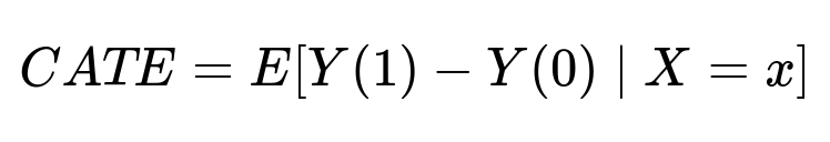 CATE is the Conditional Average Treatment Effect for users with features X. Estimating it requires methods such as inverse probability weighting, regression adjustment, or meta-learners (S-learner, T-learner, X-learner). Choosing the best estimator demands internal experimentation and rigorous checks.