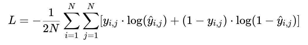 In this formula, N is the mini-batch size, y_{i,j} is 1 if item i and item j were historically paired in an outfit and 0 otherwise, and hat{y}_{i,j} is the predicted probability that items i and j should go together based on the cosine distance of their embeddings. The row- and column-wise cross-entropy losses are averaged to obtain the final loss value, which encourages the model to place matching items close in embedding space and incompatible items farther apart.