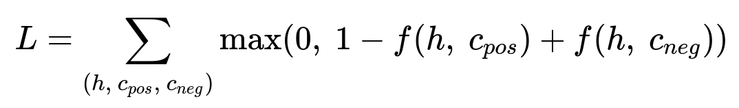In the above, h stands for the hotel embedding, c_{pos} and c_{neg} stand for positive and negative concept embeddings, and f is the scoring function. The goal is to push the model to assign higher similarity to (h, c_{pos}) than to (h, c_{neg}).