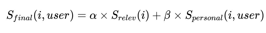 The system balances general relevance with personalization. A typical final score S_final(i, user) might combine a relevance term S_relev(i) and a personalization term S_personal(i, user). One way to show this combination is: