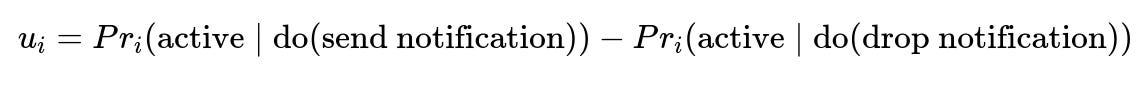 Pr_i(active | do(drop notification)) is the probability that user i remains active if the notification is dropped.