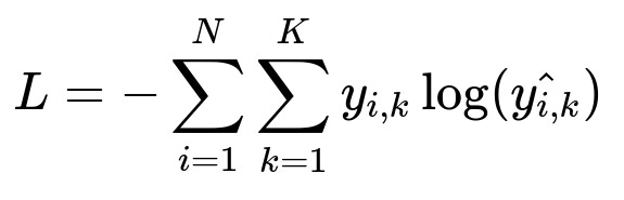 L is the cross-entropy loss. N is the number of training examples. K is the number of classes. y_{i,k} is 1 if image i belongs to class k, else 0. hat{y_{i,k}} is the predicted probability of class k for image i.