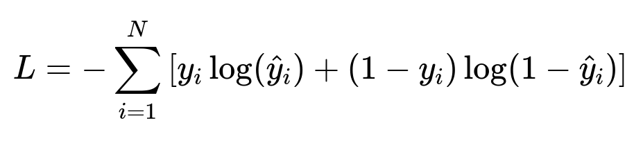This formula measures how well the model’s predicted probabilities match the true labels. The term y_i log(hat{y}_i) penalizes incorrect predictions for the positive class, while (1 - y_i) log(1 - hat{y}_i) penalizes incorrect predictions for the negative class.