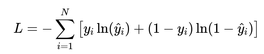 y_i is the true label for the i-th training example in {0, 1}. hat y_i is the predicted probability of the positive class for the i-th example. N is the total number of examples. The negative log-likelihood penalizes confident but wrong predictions.