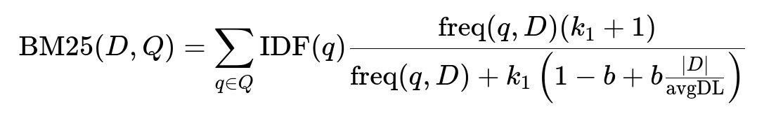 freq(q, D) is the frequency of term q in document D. IDF(q) is the inverse document frequency of q. k1 and b are constants controlling term saturation and length normalization. |D| is the document length and avgDL is the average document length in the index.